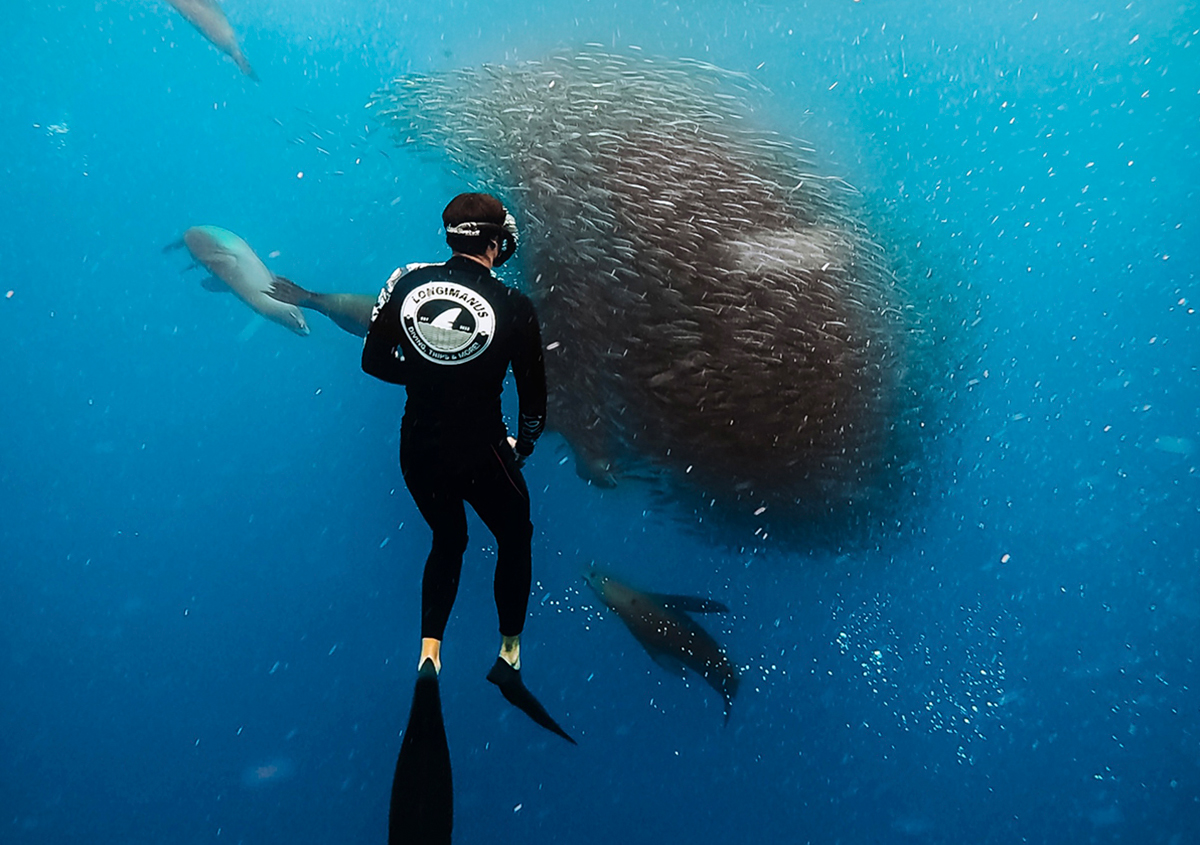 Para nosotros es sin duda uno de los puntos fuertes del viaje. Pasaremos dos días completos en busca de las enormes bolas de sardinas para alucinar con lo que es, literalmente, una barra libre de pescado para los depredadores locales; lobos marinos, ballenas, delfines, marlins, dorados, aves de todo tipo… todos a una atiborrándose de las miles y miles de sardinas.
